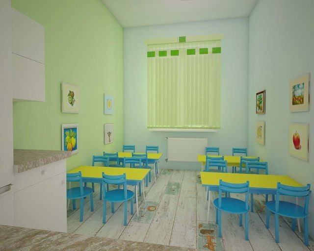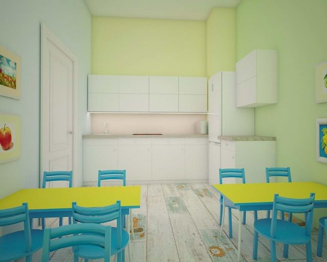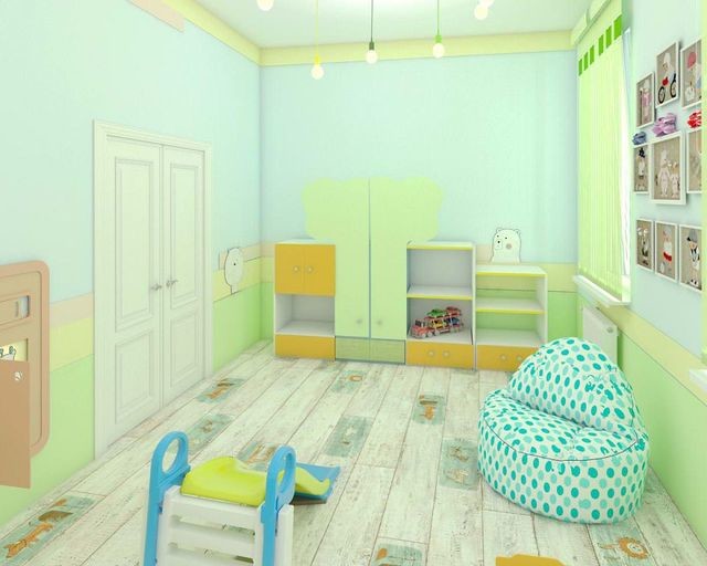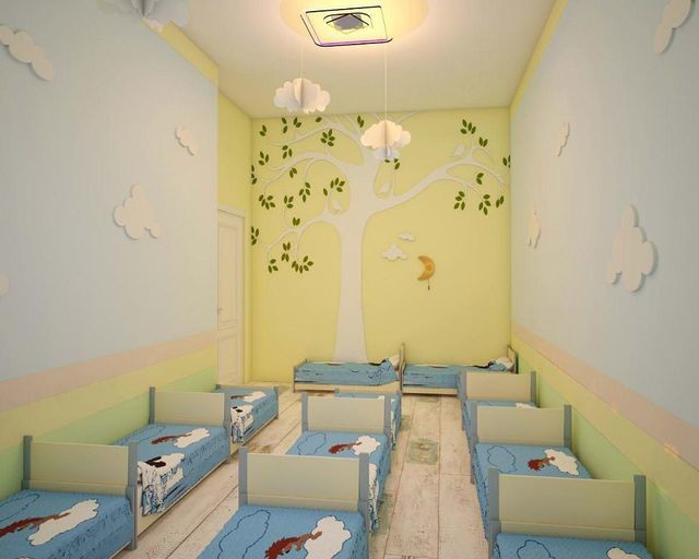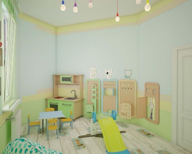 Уютные и светлые помещения, в которых круглый год поддерживается комфортная температура, обставлены современной мебелью. Здесь есть столовая, игровая комната, класс для развивающих занятий, спальня с удобными кроватками, коридор с индивидуальными шкафчиками. Ежедневно в помещениях проводится влажная и дезинфицирующая уборка.